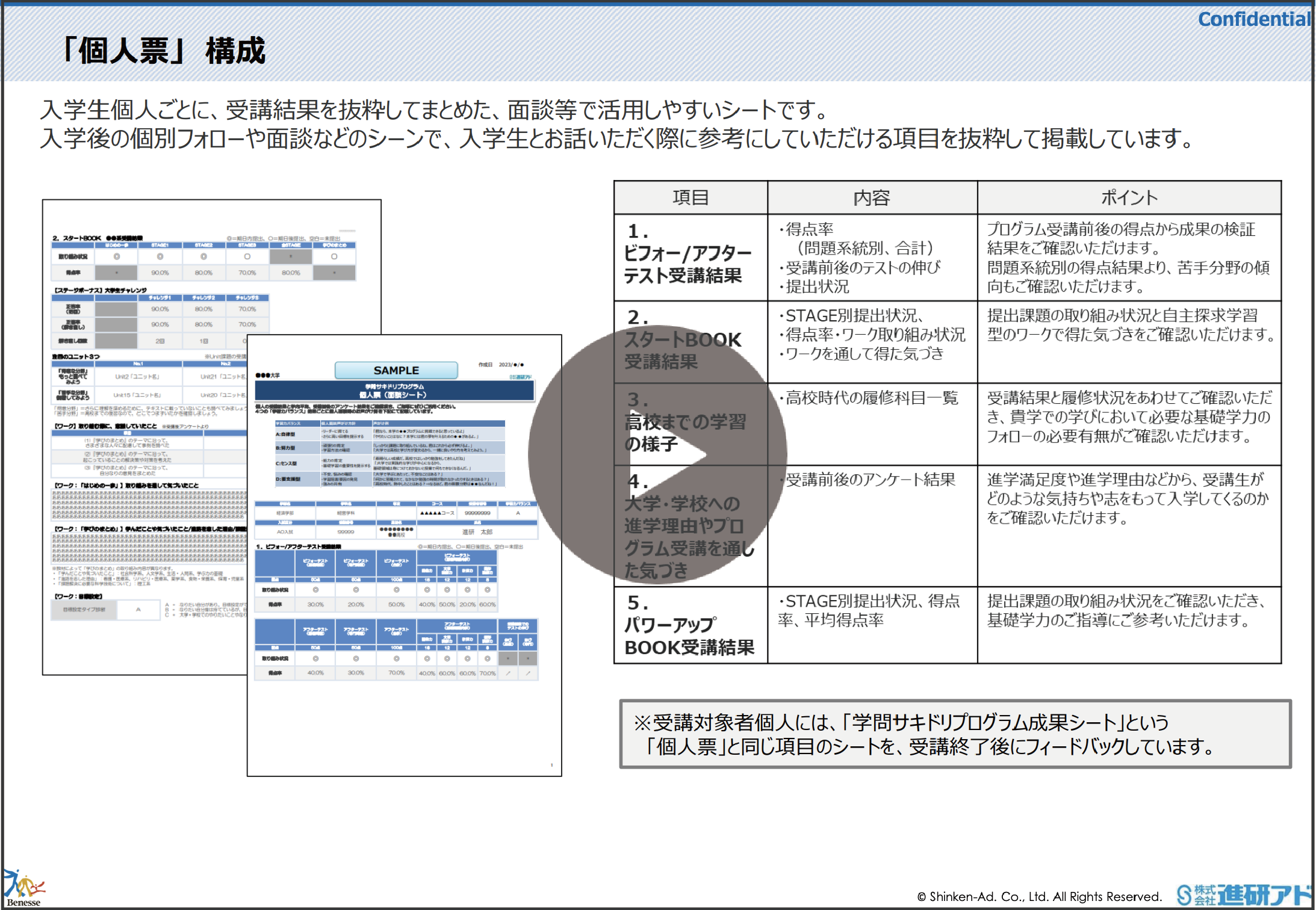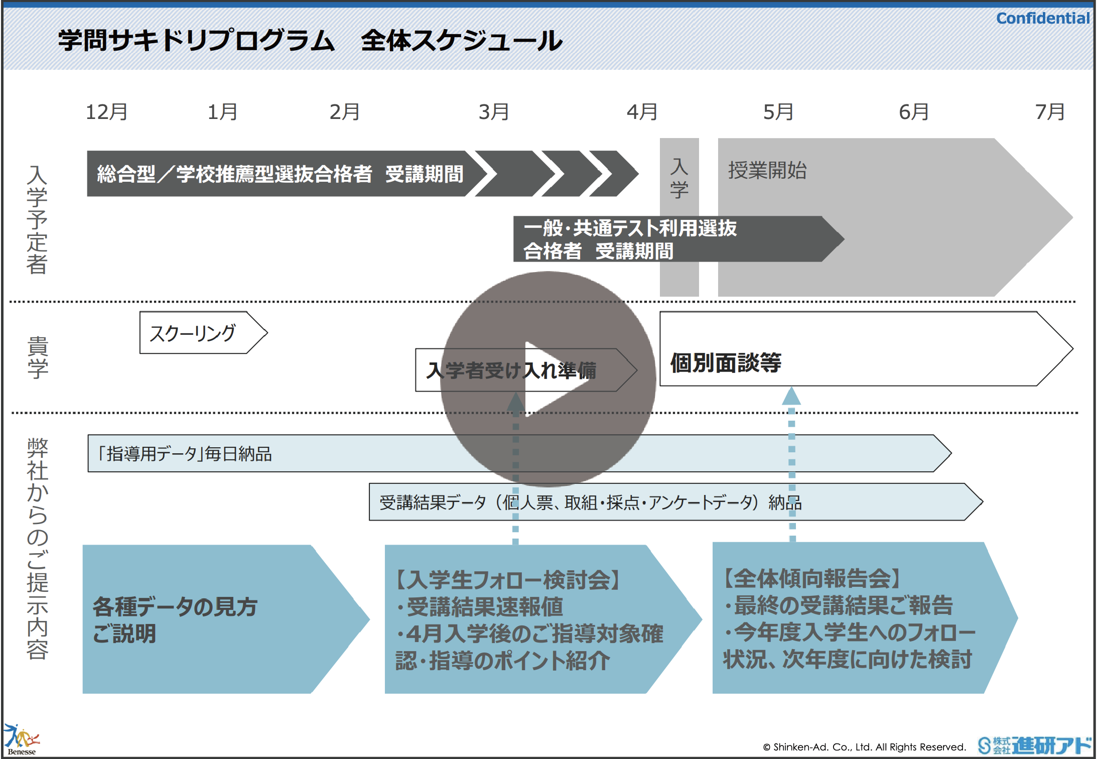 再生時間:05:00ご入学生へのフォロースケジュールや、学問サキドリプログラムの受講結果としてご納品しているデータの種類について説明しております。