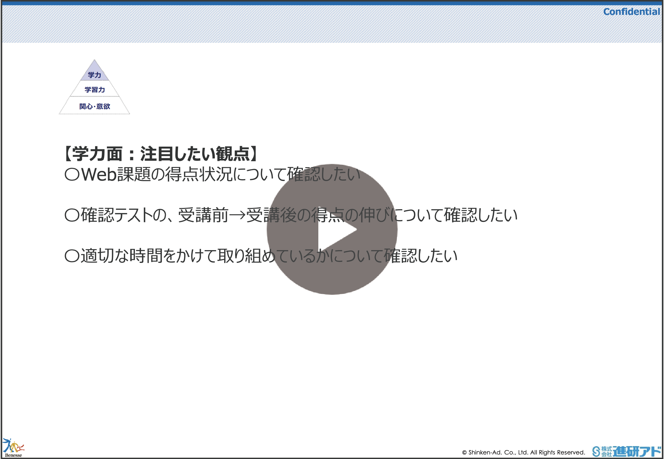 再生時間:04:55指導用データより、「Web課題の得点」や「受講前後の確認テストの得点の伸び」等の確認方法について説明しております。