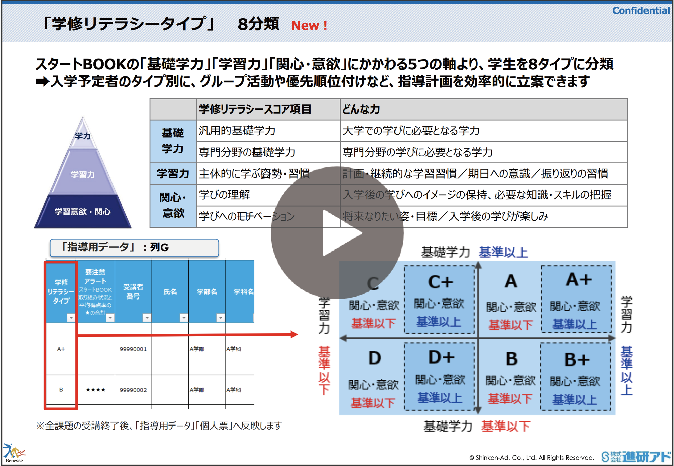 再生時間:02:41「基礎学力・学習力・関心意欲」の3軸により、学生を8つの属性タイプに分類した学修リテラシータイプについて説明しております。